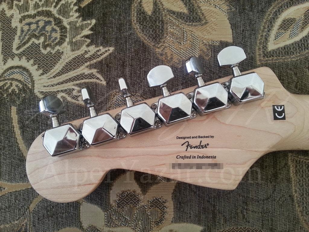 Squier Bullet Strat serisi gitarın Headstock kısmının arkadan görüntüsü. Gitarın seri numarası ve üretim yeri burada yazıyor.