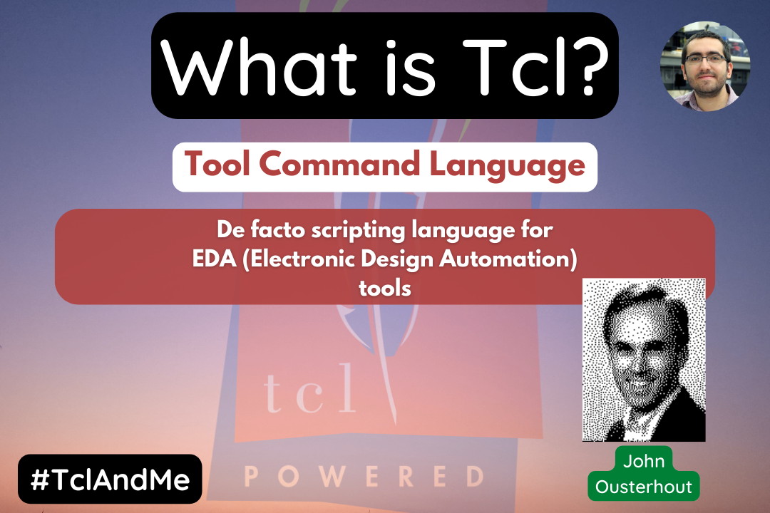 Tcl (pronounced tickle but there is no harm in pronouncing t c l) is a programming language created by John Ousterhout in 1988. He was working on EDA (Electronic Design Automation) tools and created the language for this kind of tools. Name of the language aligns with its purpose: T stands for Tool, C is for Command and L is for Language. Although each letter represents a word, the preferred name of the language is Tcl not TCL, only T is capital (but again, there is no harm in writing TCL).