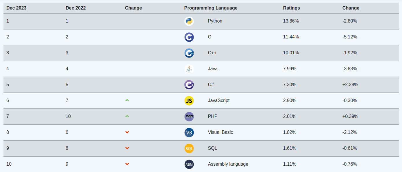 TIOBE Index, bilinirliği yüksek bir endeks olsa da birçok kişi tarafından kullandığı yöntem dolayısıyla eleştirilmektedir. Aralık 2023 itibariyle oluşturulan sıralama şu şekildedir: