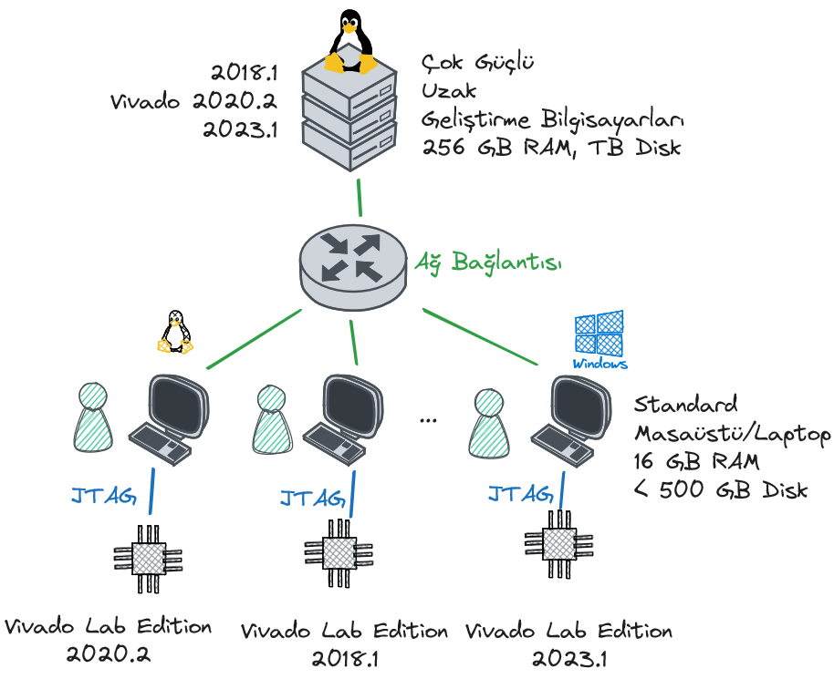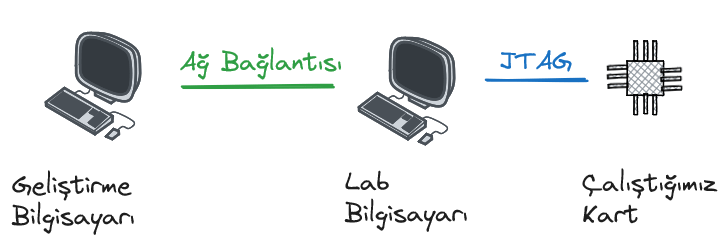 Yukarıdaki yapıda ağ üzerinden “bir şekilde” bağlı iki adet bilgisayar görüyoruz. Bu bilgisayarların bir tanesine Platform Cable (demo kartlar üzerindeki dahili JTAG gibi benzer bir donanım olabilir) ile kartın JTAG arayüzü bağlı. Bu bağlantıda kartın bağlı olduğu bilgisayara lab bilgisayarı, diğerine ise geliştirme bilgisayarı diyeceğiz.