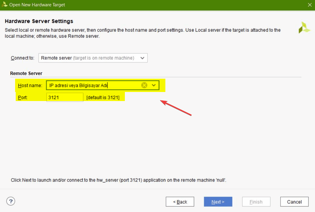 numarasını yazıyoruz. Varsayılan olarak hw_server 3121 nolu portu dinlediği