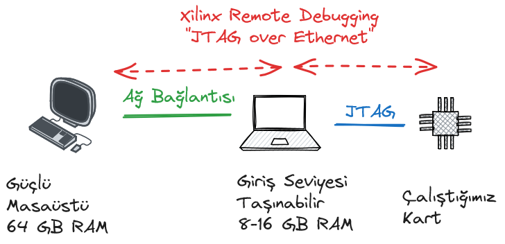 Vivado ve Vitis’in yeni sürümleri çıktıkça ve entegreler de büyüdükçe bu yazılımların talep ettiği disk ve RAM boyutları hızla artıyor. Örneğin AMD Vitis 2023.2, 64 GB RAM öneriyor. Elbette tüm Vitis projeleri için bu kadar belleğe ihtiyaç yok ama basit projelerde bile 8-16 GB belleğin yetersiz kalabildiğini hemen görebiliyorsunuz. Bazı mühendisler, çalıştıkları kartı bilgisayarlarının yanında tutabilecek kadar şanslı ama birçok mühendis de bir sistem üzerindeki bir kartta çalışmak durumunda kalıyor. Örneğin bir sisteme entegre edilmiş bir kart, masanızdan veya labınızdan uzak bir yerde oluyor ve o sistemin yanına bir laptop ile gitmek gerekiyor. Görece güçlü laptoplar, masaüstü sistemler kadar yaygın değil. Bir seçenek Vitis’i doğrudan çalıştırabilecek güçlü laptoplar almak (maliyet açısından uygun olmayabilir, ağır olabilir, başkasının bilgisayarında çalışmanız gerekiyor olabilir). Diğer bir seçenek de basit bir laptop alıp, bunu hedef karta sadece JTAG bağlantısını almak için takmak ve ağ üzerinden daha güçlü bir bilgisayara bu JTAG bağlantısını Xilinx’in sağladığı Remote Debugging altyapısı ile açmak. Bu sayede uzaktaki güçlü masaüstü bilgisayar sanki USB’den Platform Cable takılıymış gibi kart üzerindeki entegreye erişebilecektir.