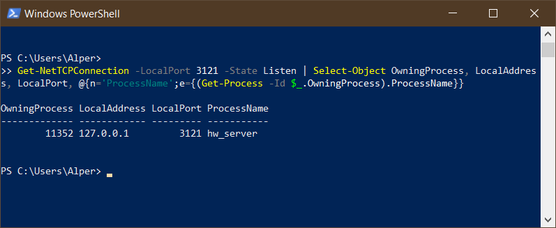 Get-NetTCPConnection -LocalPort 3121 -State Listen | Select-Object OwningProcess, LocalAddress, LocalPort, @{n='ProcessName';e={(Get-Process -Id $_.OwningProcess).ProcessName}}