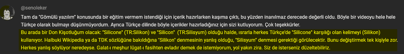 siliconolan elementin adını Türkçe’ye ağız alışkanlığısilikonolarak çevirmişim. Oysa Türkçe’desilikondediğimiz şey, İngilizce’desiliconeolarak geçmektedir. Türkçe’deki doğru karşılığısilisyumolmalıdır. 1, 2 Bu, videoyu çekerken hiç aklıma gelmedi. Aslındasilisyumkelimesine de oldukça aşinayım çünkü küçüklüğümdesilisyum.netsitesindeki yazıları az okumadım (an itibariyle ne yazık ki siste kapanmış, üzüldüm). Nerdeyse herkesin aklında bu kelimenin Türkçe karşılığınınsilikonolmasının önemli bir sebebi deSilicon Valleye hemen hemen her zamanSilikon Vadisidememizdir, dilimizeSilisyum Vadisiolarak yerleşmemiş olmasıdır. Bunu videoya yorum yazan Şenol Eker Bey’in yorumu sayesinde fark ettim. Yorumun ekran görüntüsünü ekliyorum. Bu düzeltmeyi bu videoda yapamasam da ileride üreteceğim içeriklerde dikkat edeceğim. Kendisine buradan da teşekkür ederim.