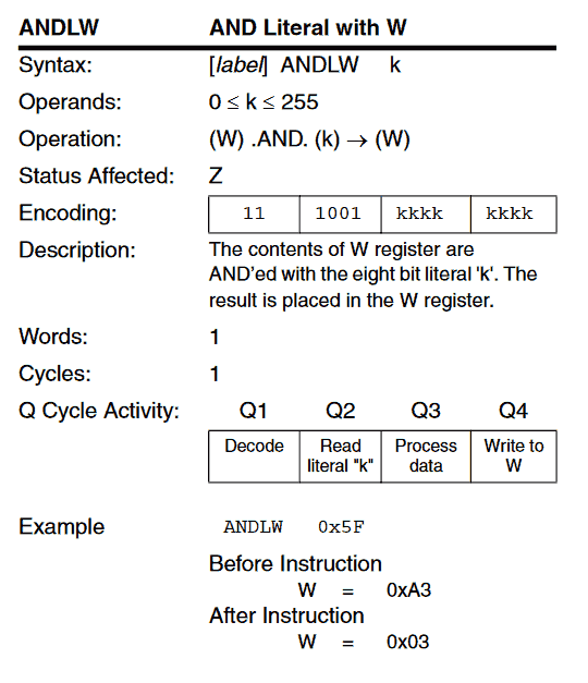 consider the ANDLW instruction. The detailed explanation is provided on page 57